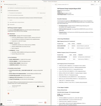 Claude Desktop: KI-generierter Dump-Analyse-Report mit priorisierten Findings und Fehlerverteilung