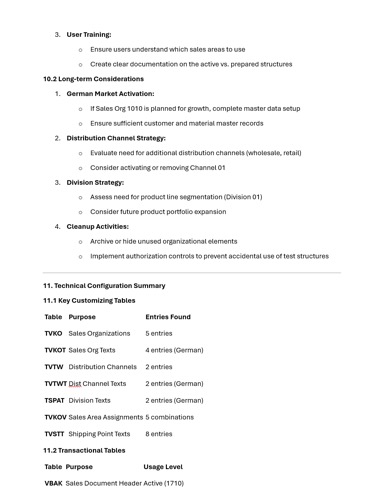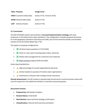Besonders wertvoll ist die Tiefe der Analyse. Die KI hat nicht nur die Customizing-Tabellen gelesen, sondern auch Transaktionsdaten herangezogen: Verkaufsbelege aus VBAK, Lieferungen aus LIKP, Kundenstammdaten aus KNVV, Materialstammdaten aus MVKE. Daraus konnte sie ableiten, dass von fünf konfigurierten Verkaufsorganisationen nur eine tatsächlich signifikantes Transaktionsvolumen aufweist. Eine zweite ist vorbereitet, aber kaum genutzt. Drei weitere sind konfiguriert, zeigen aber keinerlei Aktivität.