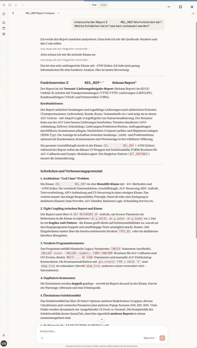Auf eine einfache Anweisung hin hat Claude über den MCP-Server den Report und die zugehörige Klasse vollständig geladen und analysiert. Die KI hat dafür eigenständig mehrere MCP-Tool-Calls orchestriert: Objektsuche, Source-Code-Abruf, Klassenstrukturanalyse, Chunk-weises Laden der Methoden und schließlich die systematische Auswertung.