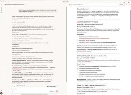 Die KI hat die Findings nicht nur aufgelistet, sondern priorisiert: drei Programme als „Critical – Sofortmaßnahme erforderlich“, acht als „High Risk“, rund 30 als „Medium Risk“. Für jede Kategorie wurden konkrete Handlungsempfehlungen formuliert – von „Programm sofort deaktivieren“ über „Autorisierungsobjekt S_TABU_DIS ergänzen“ bis hin zu mittelfristigen Maßnahmen wie der Einführung von Coding Standards und Peer Reviews.